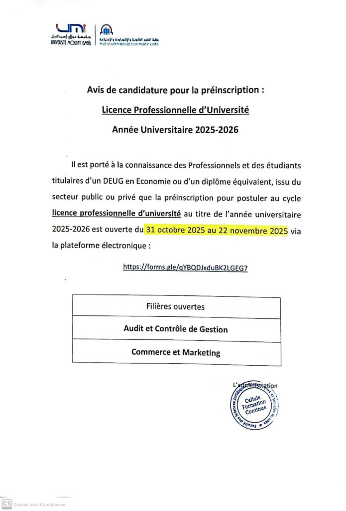 Candidature pour la pré inscription : LICENCE PROFESSIONNELLE D’UNIVERSITE