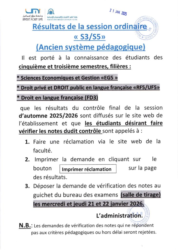 Résultats S3/S5 – Session ordinaire 2025/2026 (Ancien système)