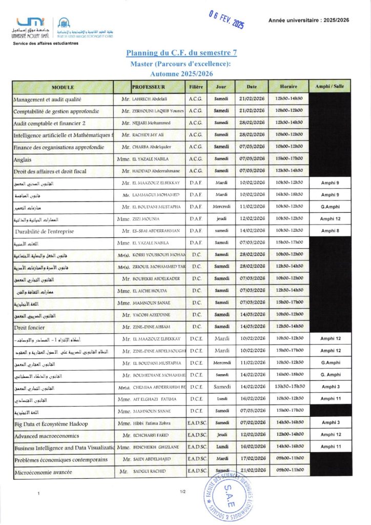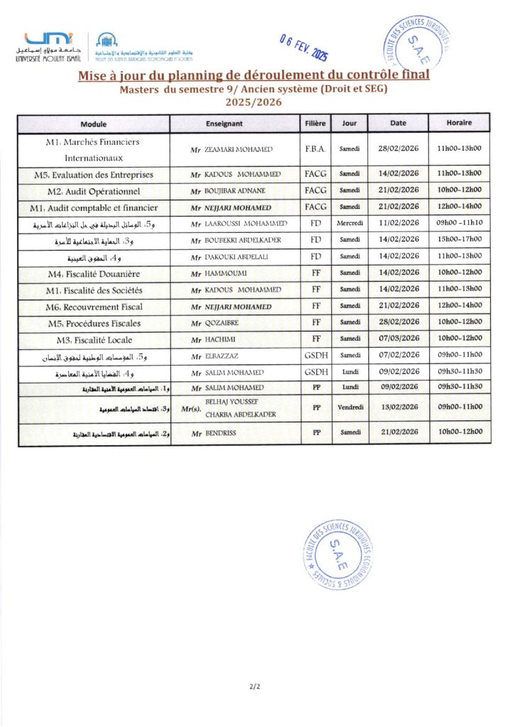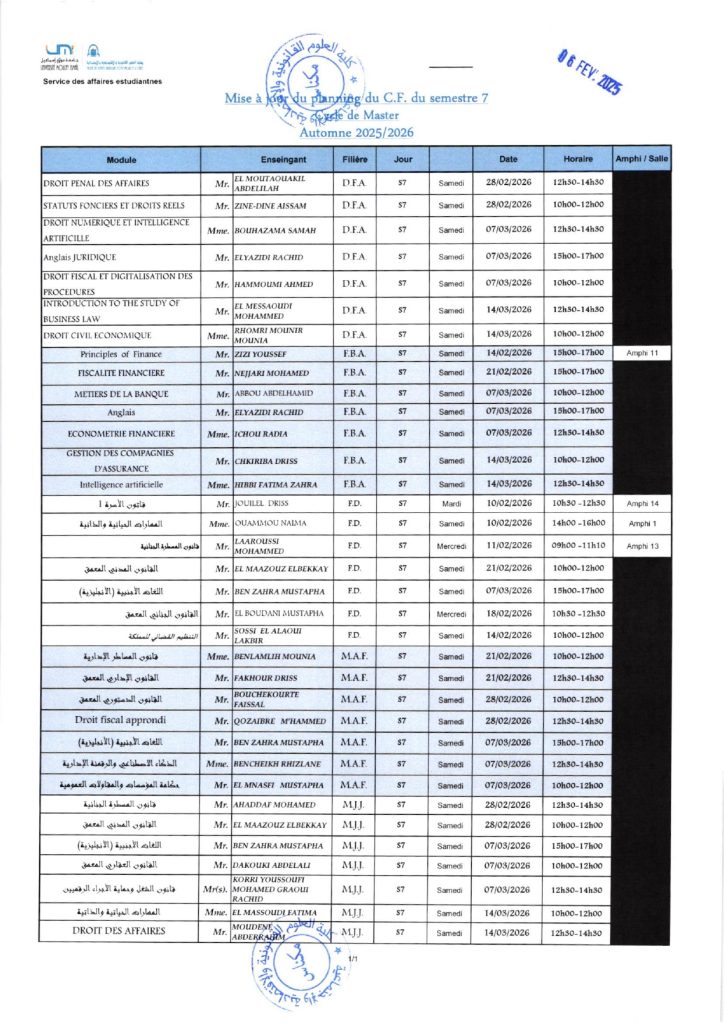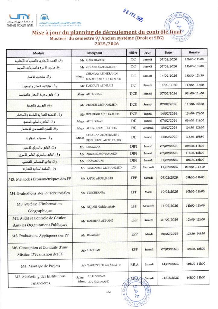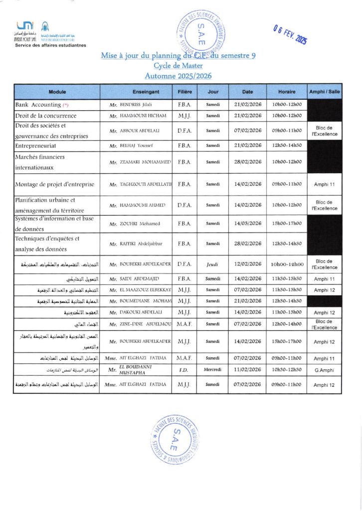 Plannings du contrôle final – Licence & Master (2025/2026)